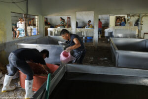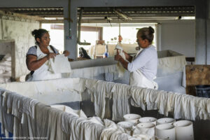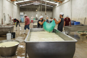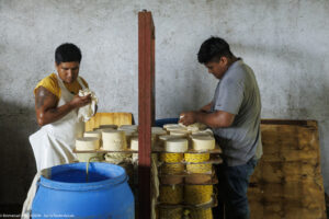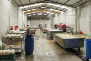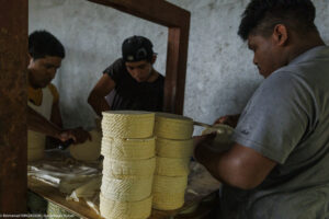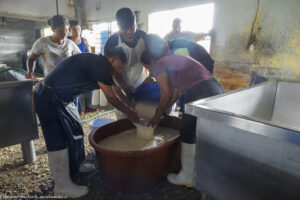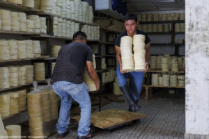 Dans cette fromagerie de Jesus Carranza dans l’État de Veracruz au Mexique, 45 personnes s’activent à transformer chaque jour les 13000 litres de lait livrés par 170 producteurs. On fabrique ici le traditionnel Queso de reata (enreatado), pressé dans une corde pour l’égouttage. Nous étions vendredi après-midi : dernière fabrication du jour, démoulage, lavage et expédition des fromages fabriqués depuis le début de la semaine. « Pourquoi êtes-vous venus de si loin pour nous rencontrer ? »