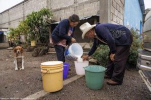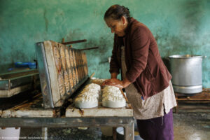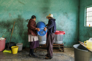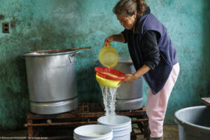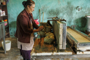 Chez Don Eladio et Doña Carolina, État de Puebla au Mexique. La collecte dans la vieille « américaine » déglinguée, le voisin qui vient chercher le petit-lait, la fabrication, la presse en bois sculptée à la main par Don Eladio, le tenate, ce panier tressé dans lequel on moule le fromage traditionnel. « Cela fait déjà 35 ans qu’on fait ça. On ne peut pas s’arrêter, sinon le lait se gâte. Il faudrait avoir une glacière pour le conserver dans la journée. Et comme on a acheté le lait, il faut le payer. Si on le laisse se perdre, avec quoi le paierons-nous ? Alors il faut être là. Si on sort, c’est juste un petit moment, trois heures, quatre heures. Ici il n’y a pas un jour sans travail ».