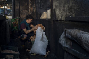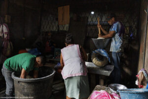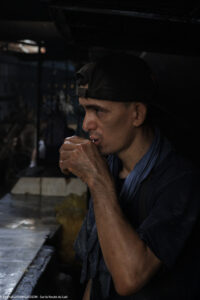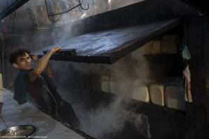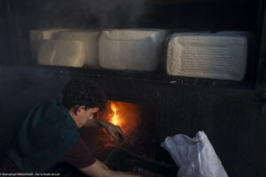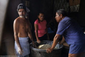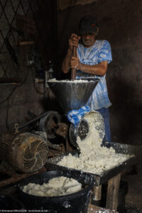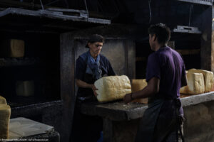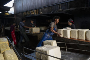 Dès 3 heures du matin, les camions arrivent de tout le Nicaragua pour livrer les fromages au marché Ivan Montenegro à Managua. Les gros blocs – les plus lourds pèsent près de 80 livres – seront fumés une quarantaine de minutes. Sortis du four, lavés à grande eau, ils retourneront en charrette bras chez les acheteurs où viendront s’approvisionner les revendeurs de toute la ville. Dans un autre local, les vendeurs apportent le caillé qui sera passé au broyeur, parfois en y ajoutant un peu d’eau pour lui donner une texture plus onctueuse.