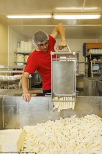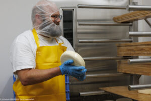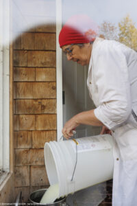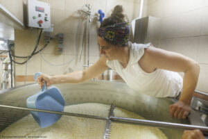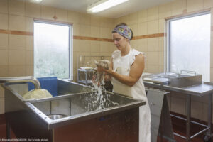Chez Gary, le chevrier, et aAagje la fromagère, la fabrication fermière artisanale n’a pas dit son dernier mot ! Aagje, « La louche est l’outil indispensable des fromageries fermières. Le geste exige précision, régularité et délicatesse. La louche doit être remplie d’un tour de poignet vif et fluide dans le caillé, dont la surface parfaitement lisse est recouverte d’une légère pellicule de petit-lait. Le contenu de chaque louche est déposé avec soin au fond d’une centaine de moules de différentes tailles. Il faut ainsi quatre passages successifs pour fabriquer les bûchettes et les faisselles. Et pas question de fracturer le précieux caillé et de risquer que le petit-lait s’égoutte trop rapidement, car le fromage devient alors plus sec et plus friable. La constance et la précision du geste donneront une texture parfaitement lisse et une coupe franche aux différents fromages produits ».