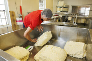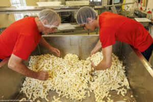 Les Grondines… ce nom qui vient du grondement des vagues sur les galets quand le vent souffle fort sur les rives du Saint-Laurent. La ferme s’appelle aussi « AACAT » pour les quatre générations qui se sont succédées, Albert, qui l’a fondée en 1922, suivi par Almanzor, Charles et aujourd’hui Aurélie. Des vaches nourries à l’herbe et au foin en hiver, une des très rares fromageries au Québec qui transforme au lait cru et par-dessus tout, la sagesse. Charles, « Chaque jour, une seule question guide nos décisions. Est-ce que ce qu’on fait aujourd’hui aura encore du sens pour nos enfants et petits-enfants ? ». Une gamme de fromages affinés mais aussi le fameux fromage en grains, pâte cheddarisée, emblématique du Québec.